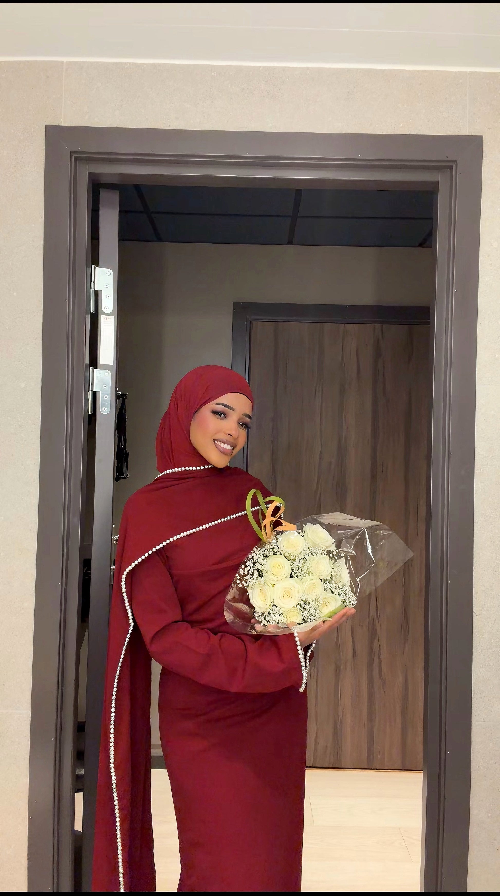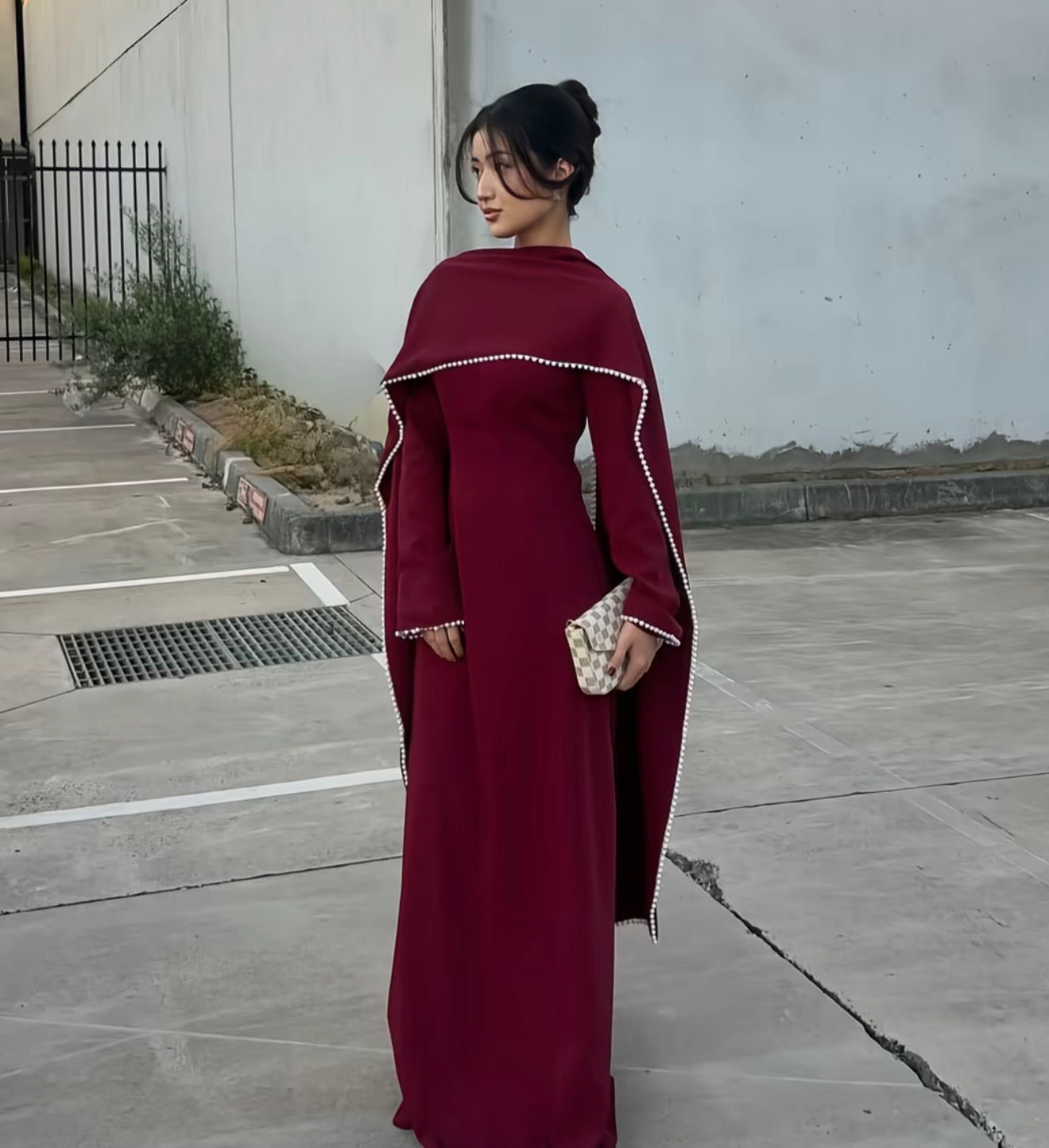 Is a stunning burgundy modest gown with elegant details, perfect for a wedding or special occasion.