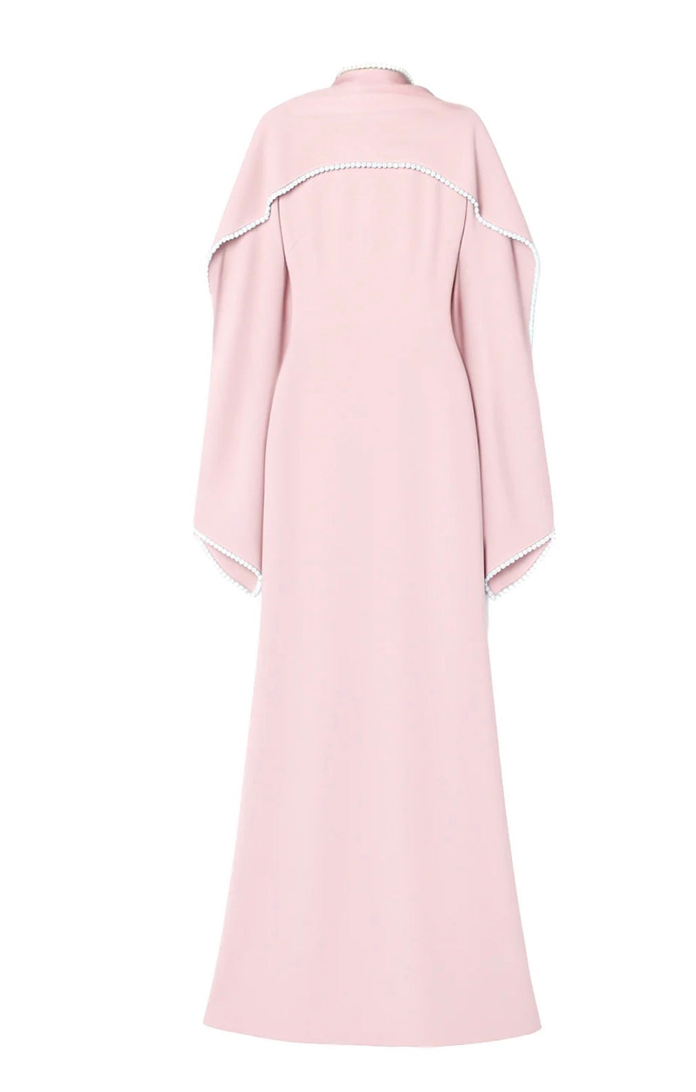 One of the most unique features is the attached cape, which flows from the shoulders to the floor, creating a dramatic and ethereal effect, almost like a bridal train.