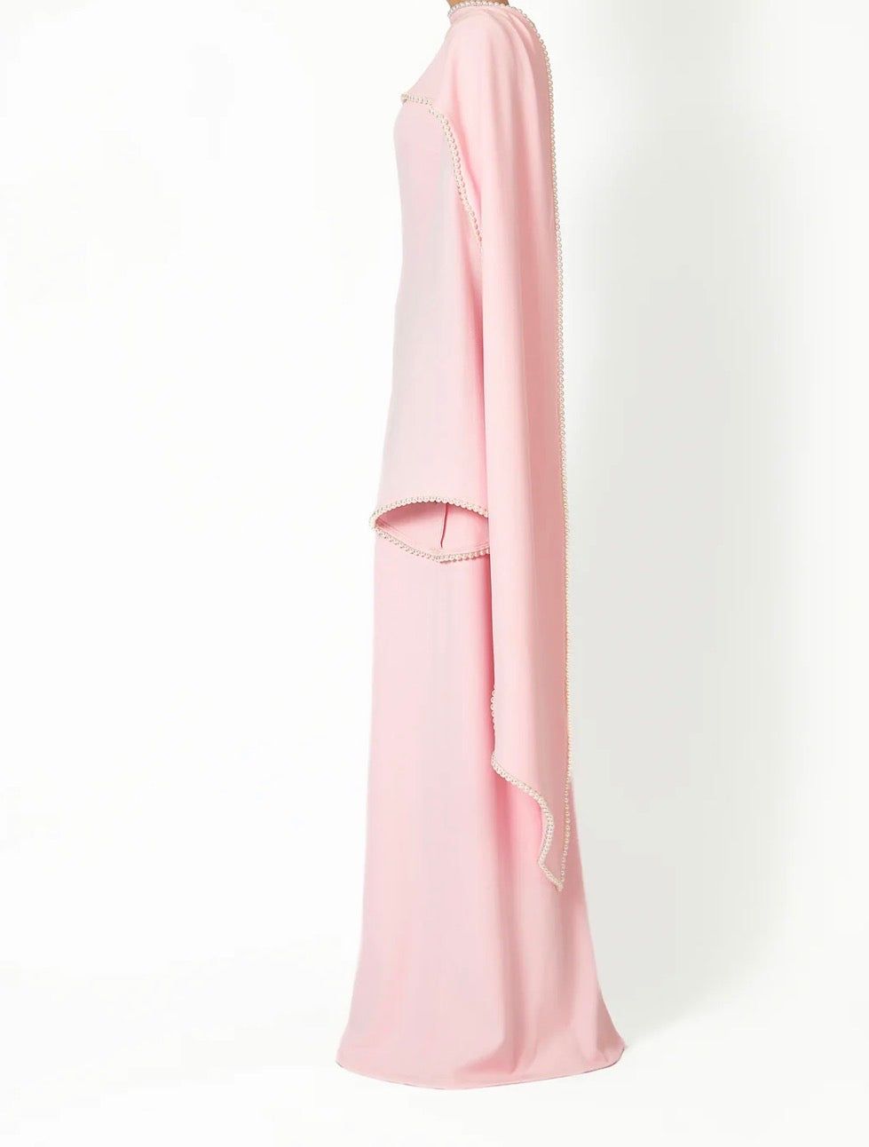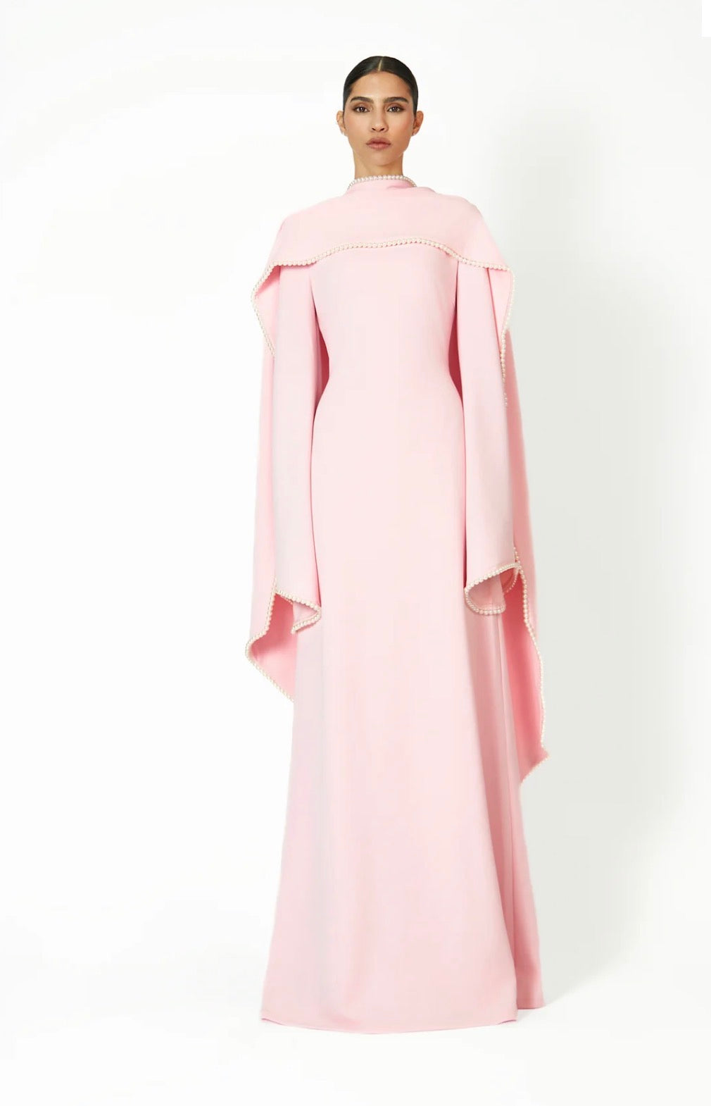 Is a stunning pink modest gown with elegant details, perfect for a wedding or special occasion.